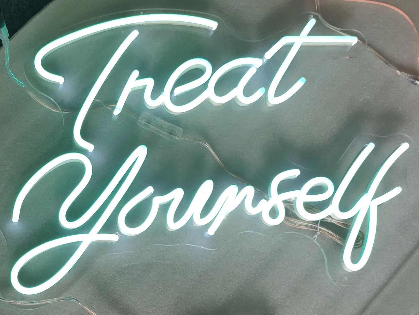 Treat Yourself Neon sign Materials Acrylic, LED, PVC Dimensions Height: 8 Inches; Width: 24 Inches; Depth: 1 Inch This is flex LED neon sign, flexible silicon tubes with LED lights inside tubes look like vintage glass neon sign. Flex LED neon sign is safe, non-frangible. It's better cho...
