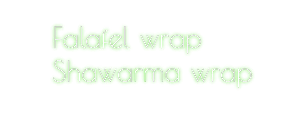 Text: Falafel wrap Shawarma wrap Text Align: left Font: PoiretColour: GreenSize: 120cm wide / 120cm X 37.62cm / 47.24in X 14.81inBackboard: Cut to Letter (free upgrade)Jacket: White JacketMounting: HangingAdd a Heart or Star (Optional): StarNeon Tube Thickness: Bold Tube (8mm) (fr...