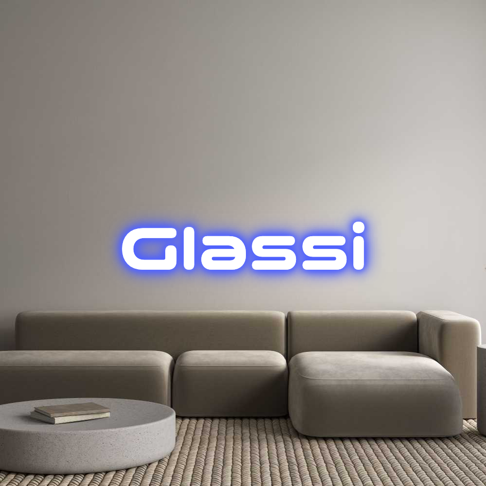 Text: Glassi Text Align: LeftFont: SpaceColor: BlueSize: 60cm wide / 60cm X 12.19cm / 23.62in X 4.8inMaterial: Outdoor (+30%) Backboard: Cut to ShapeBackboard Color: BlackJacket: White JacketMounting: HangingAdd a Heart or Star (Optional): None (Default)Neon Tube Thickness: Bold Tube (8mm) ...