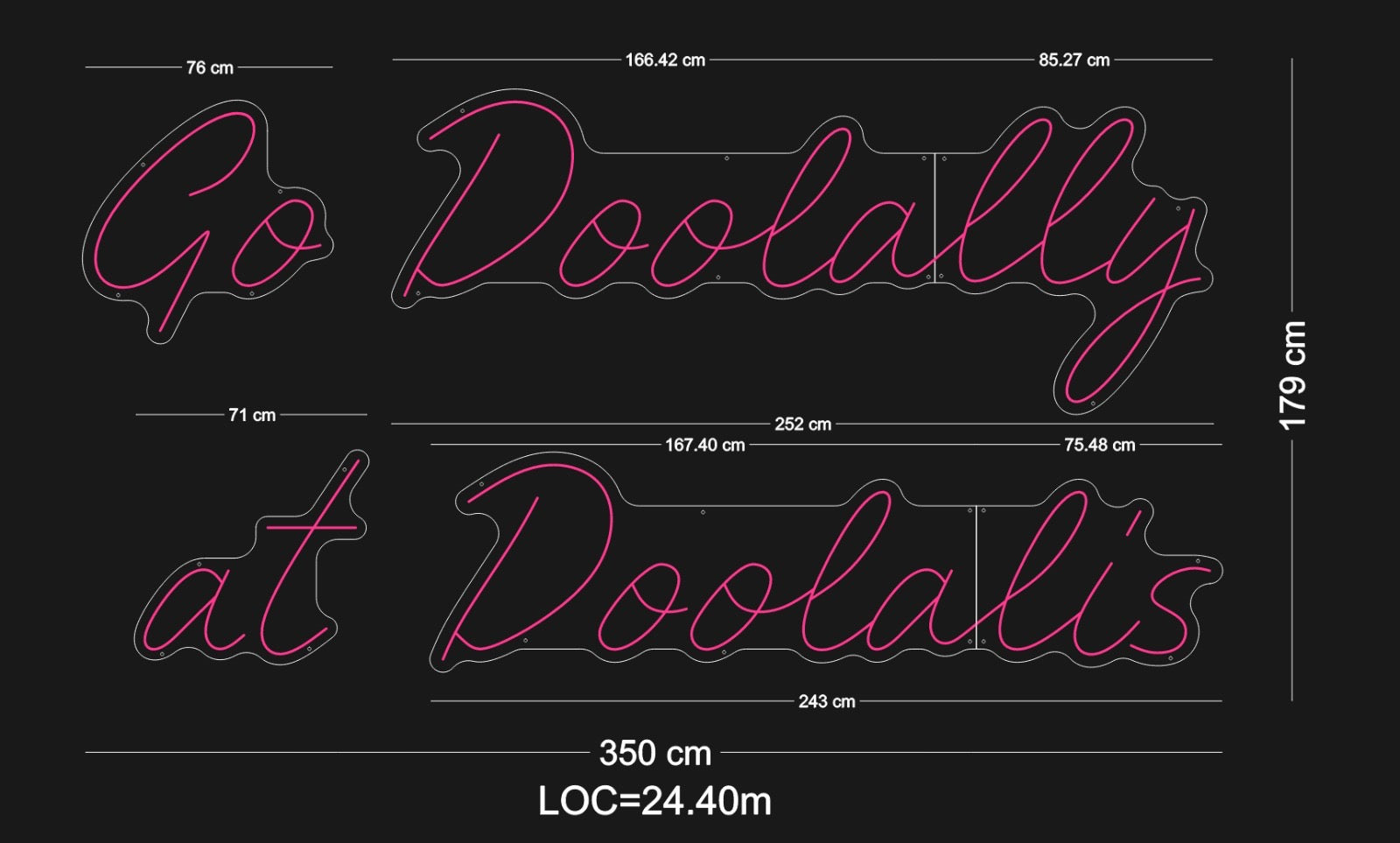 Text: Go Doolally at Doolalis Text Align: CenterFont: WorldColor: PinkSize: 350cm wide / 350cm X 179.39cm / 137.8in X 70.63inMaterial: IndoorBackboard: Cut to ShapeBackboard Color: Clear Acrylic BackboardJacket: Coloured JacketMounting: Wall mounting screwsAdd a Heart or Star (Optional): ...