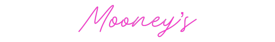 Text: Mooney’s Text Align: LeftFont: RocketColor: PinkSize: 60cm wide / 60cm X 17.14cm / 23.62in X 6.75inBackboard: Cut to Letter (free upgrade)Jacket: Coloured JacketMounting: Wall mounting screwsAdd a Heart or Star (Optional): None (Default)Neon Tube Thickness: Bold Tube (8mm) (fre...