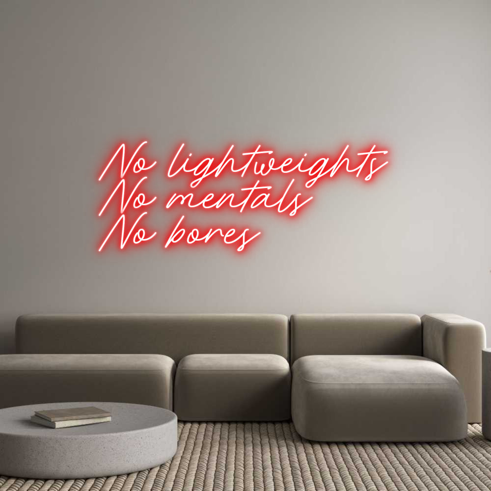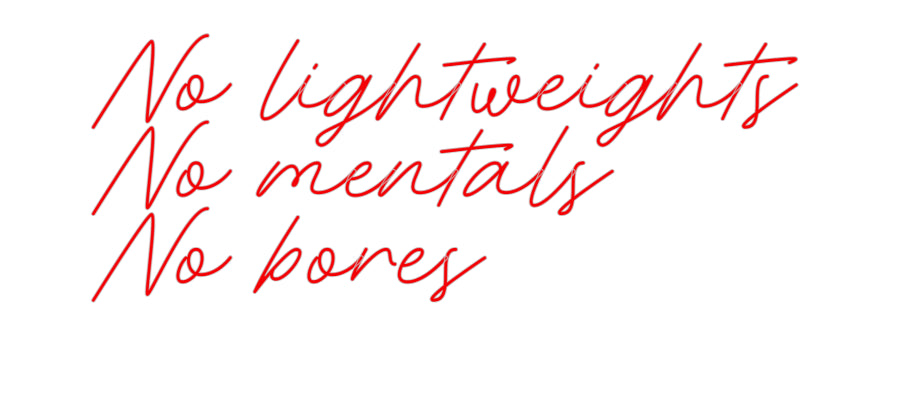 Text: No lightweights No mentals No bores Text Align: leftFont: RocketColour: RedSize: 100cm wide / 100cm X 51.83cm / 39.37in X 20.41inBackboard: Whole Board (free upgrade)Backboard Colour: Clear Acrylic BackboardJacket: Coloured JacketMounting: HangingAdd a Heart or Star (Optional...