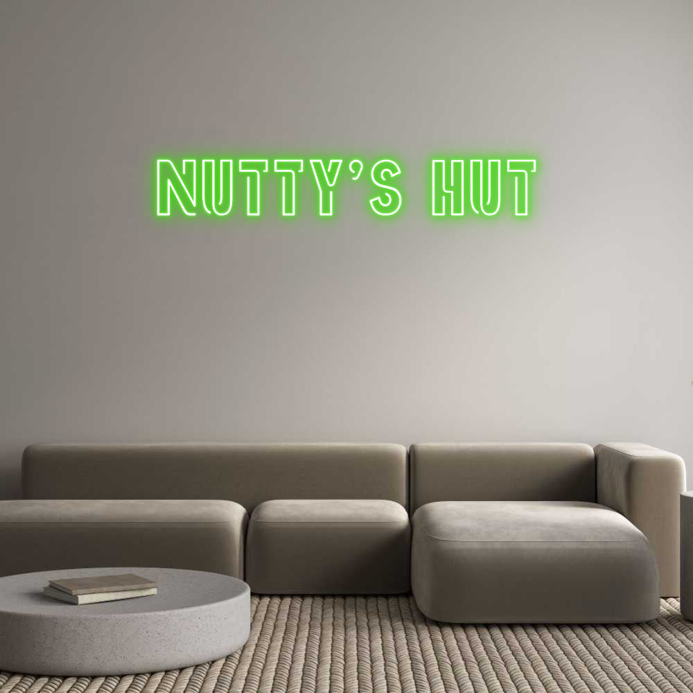 Text: Nutty's Hut Text Align: left Font: NeonColour: GreenSize: 60cm wide / 60cm X 8.73cm / 23.62in X 3.44inBackboard: Cut to Letter (free upgrade)Jacket: Coloured JacketMounting: Wall mounting screwsAdd a Heart or Star (Optional): None (Default)Neon Tube Thickness: Bold Tube ...