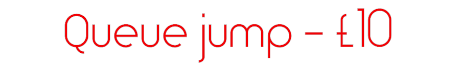 Text: Queue jump - £10 Text Align: leftFont: TimeColour: RedSize: 160cm wide / 160cm X 28.31cm / 62.99in X 11.15inBackboard: Whole Board (free upgrade)Backboard Colour: BlackJacket: Coloured JacketMounting: HangingAdd a Heart or Star (Optional): None (Default)Neon Tube Thickness: Bol...