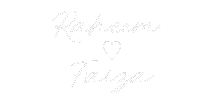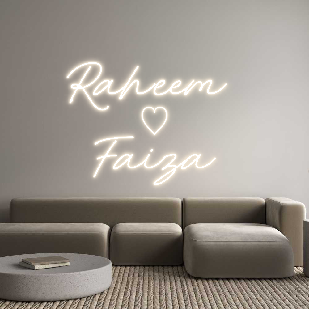 Text: Raheem ♡ Faiza Text Align: CenterFont: RocketColor: Warm WhiteSize: 60cm wide / 60cm X 58.19cm / 23.62in X 22.91inBackboard: Cut to ShapeBackboard Color: Clear Acrylic BackboardJacket: White JacketMounting: Fast mount kitAdd a Heart or Star (Optional): None (Default)Neon T...