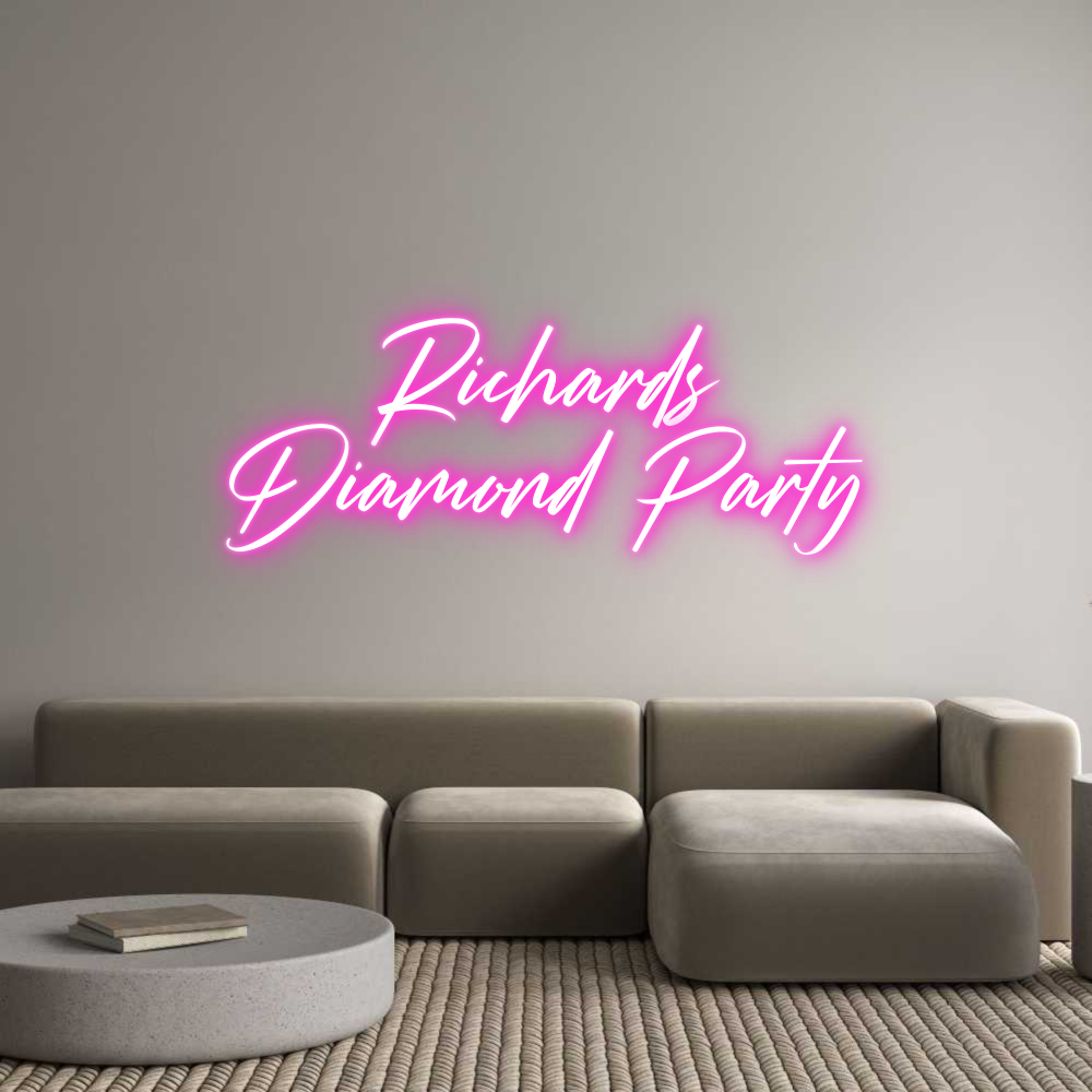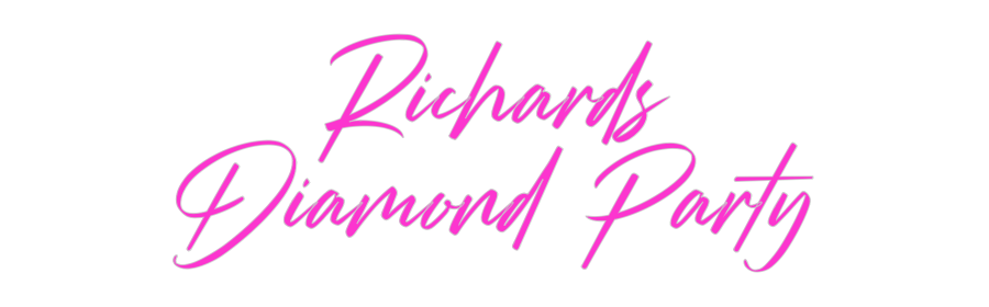 Text: Richards Diamond Party Text Align: CenterFont: StrudeColor: PinkSize: 80cm wide / 80cm X 39.71cm / 31.5in X 15.63inBackboard: Cut to Letter (free upgrade)Jacket: Coloured JacketMounting: HangingAdd a Heart or Star (Optional): None (Default)Neon Tube Thickness: Bold Tube (8mm) ...