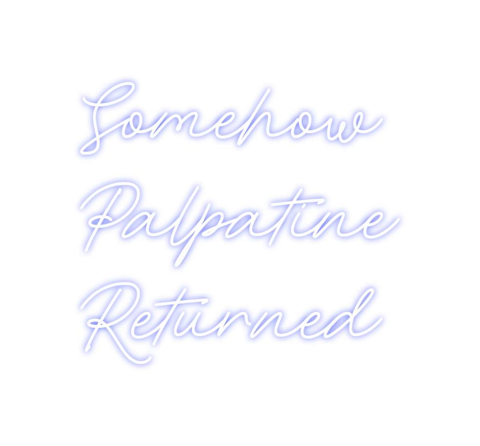 Text: Somehow Palpatine Returned Text Align: left Font: RocketColour: BlueSize: 60cm wide / 60cm X 52.1cm / 23.62in X 20.51inBackboard: Cut to Letter (free upgrade)Jacket: White JacketMounting: HangingNeon Tube Thickness: Bold Tube (8mm) (free upgrade)Remote Dimmer: YesPower Mo...