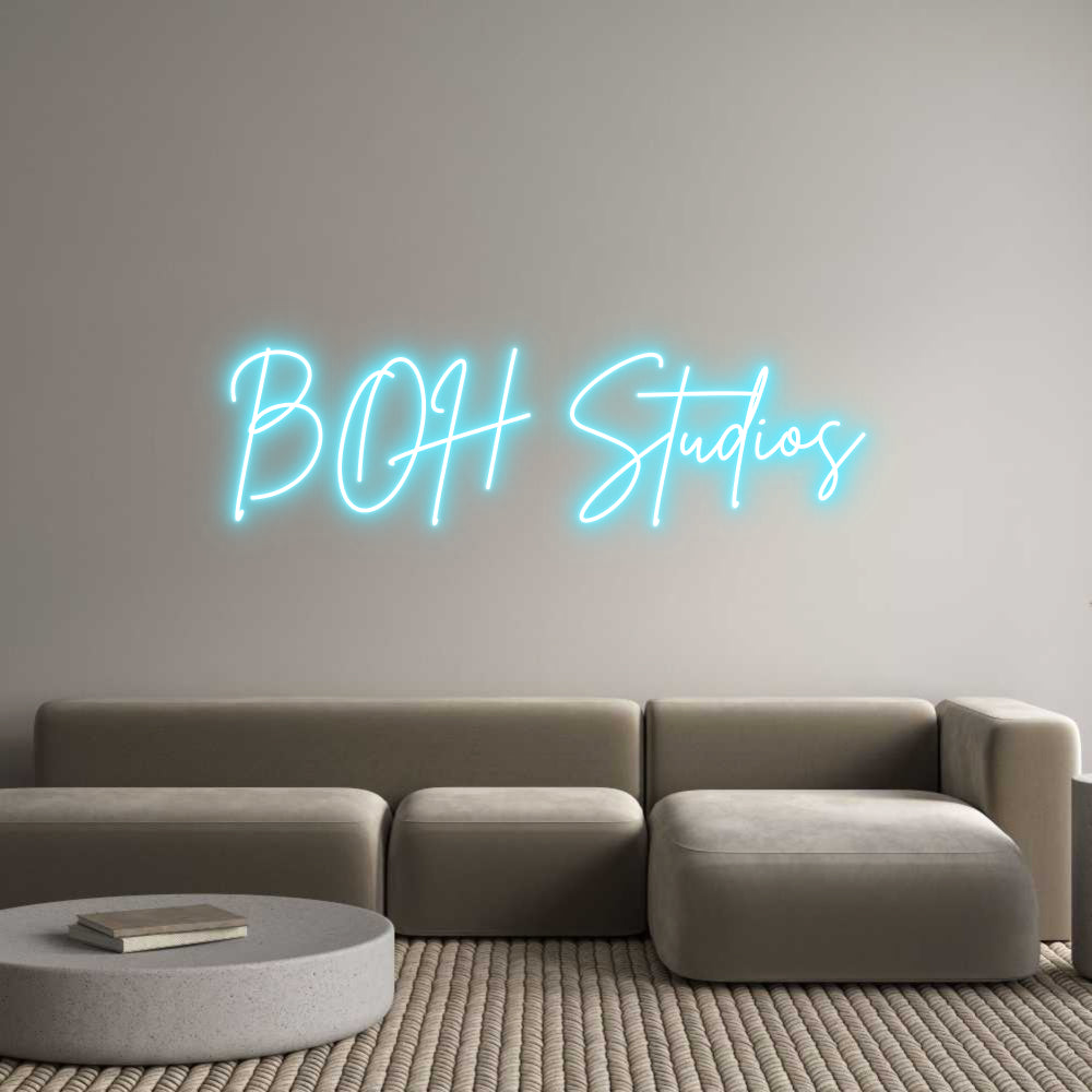 Text: BOH Studios Text Align: leftFont: BrittanyColour: Ice BlueSize: 100cm wide / 100cm X 29cm / 39.37in X 11.42inBackboard: Cut to ShapeBackboard Colour: Clear Acrylic BackboardJacket: Coloured JacketMounting: Wall mounting screwsAdd a Heart or Star (Optional): None (Default)Neon T...