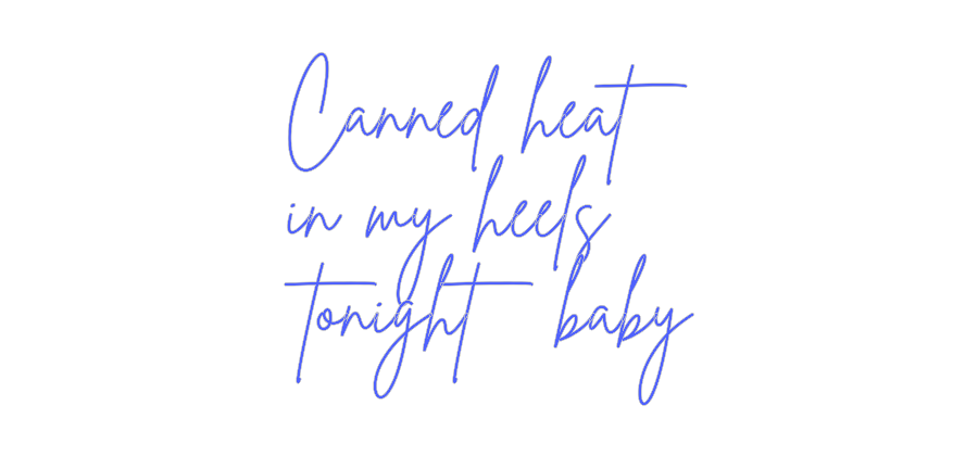 Text: Canned heat in my heels tonight baby Text Align: leftFont: BrittanyColour: BlueSize: 80cm wide / 80cm X 77.99cm / 31.5in X 30.7inBackboard: Cut to Letter (free upgrade)Jacket: Coloured JacketMounting: Wall mounting screwsAdd a Heart or Star (Optional): None (Default)Neon Tube...