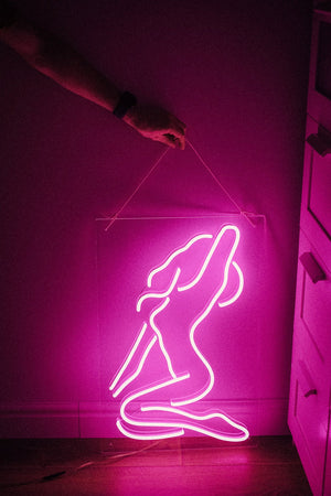 Sexy girl woman pink neon sign for bar, night club, party, erotic striptease