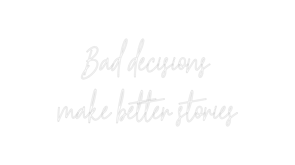 Text: Bad decisions make better stories Text Align: center Font: HestericaColour: WhiteSize: 120cm wide / 120cm X 59.84cm / 47.24in X 23.56inBackboard: Cut to Letter (free upgrade)Jacket: White JacketMounting: Wall mounting screwsNeon Tube Thickness: Classic Tube (6mm)Remote ...