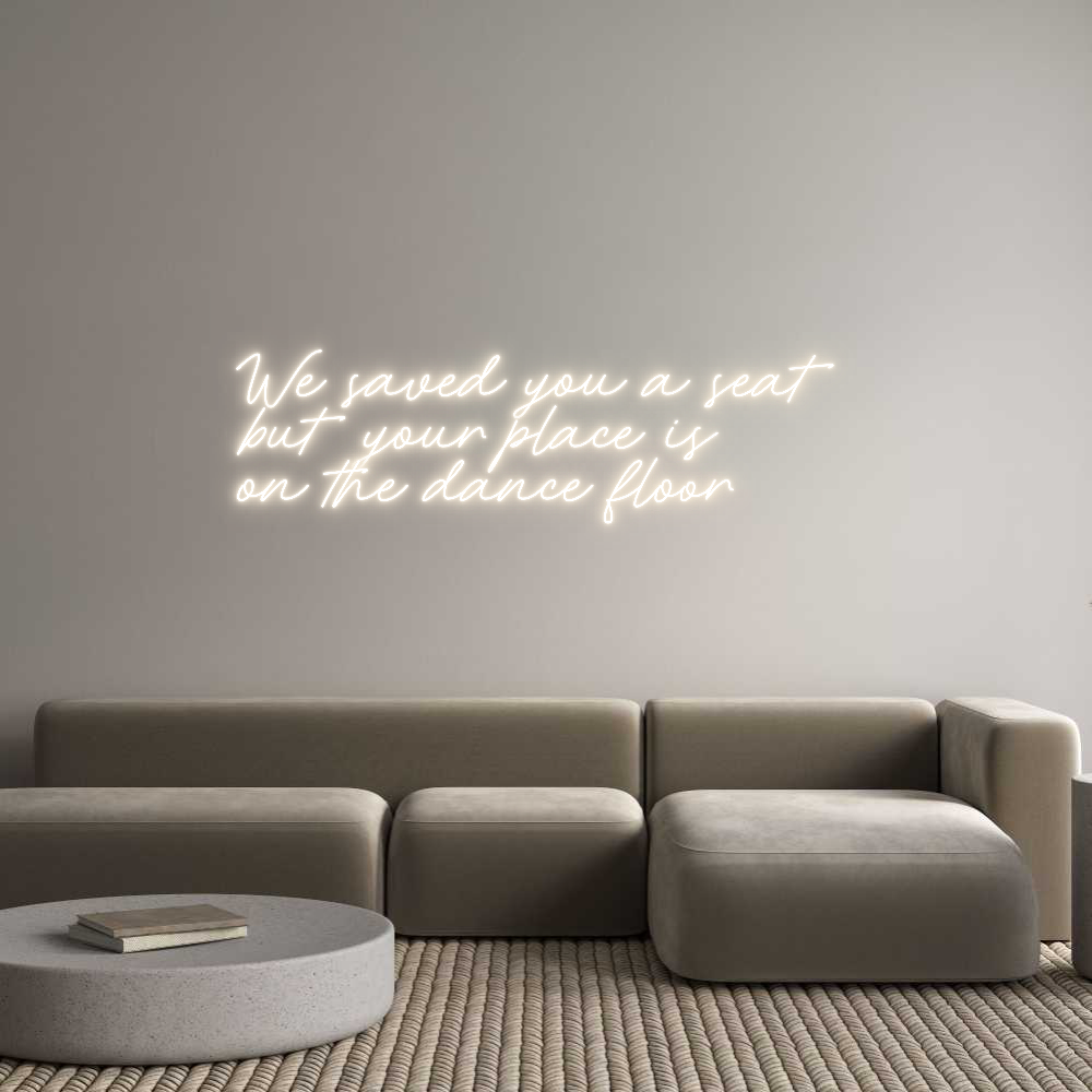 Text: We saved you a seat but your place is on the dance floor Text Align: LeftFont: RocketColor: Warm WhiteSize: 200cm wide / 200cm X 82.75cm / 78.74in X 32.58inBackboard: Cut to ShapeBackboard Color: Clear Acrylic BackboardJacket: Coloured JacketMounting: Wall mounting screwsAd...