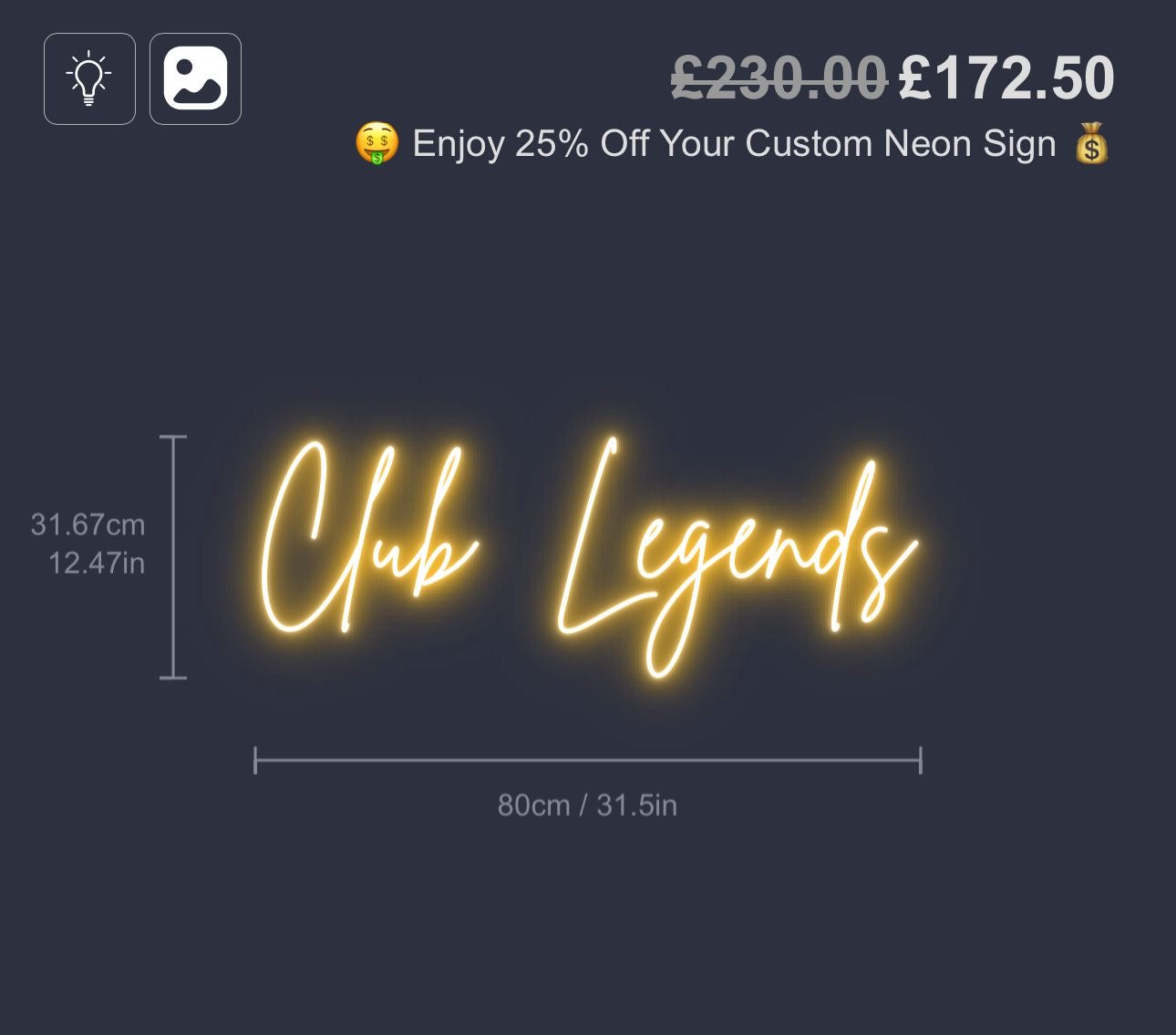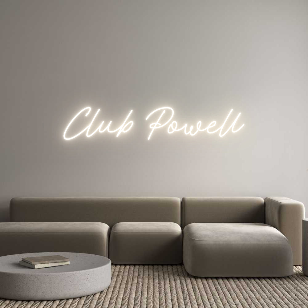 Text: Club Powell Text Align: centerFont: RocketColour: Warm WhiteSize: 100cm wide / 100cm X 17.9cm / 39.37in X 7.05inBackboard: Cut to Letter (free upgrade)Jacket: Coloured JacketMounting: Wall mounting screwsAdd a Heart or Star (Optional): None (Default)Neon Tube Thickness: Bold Tu...
