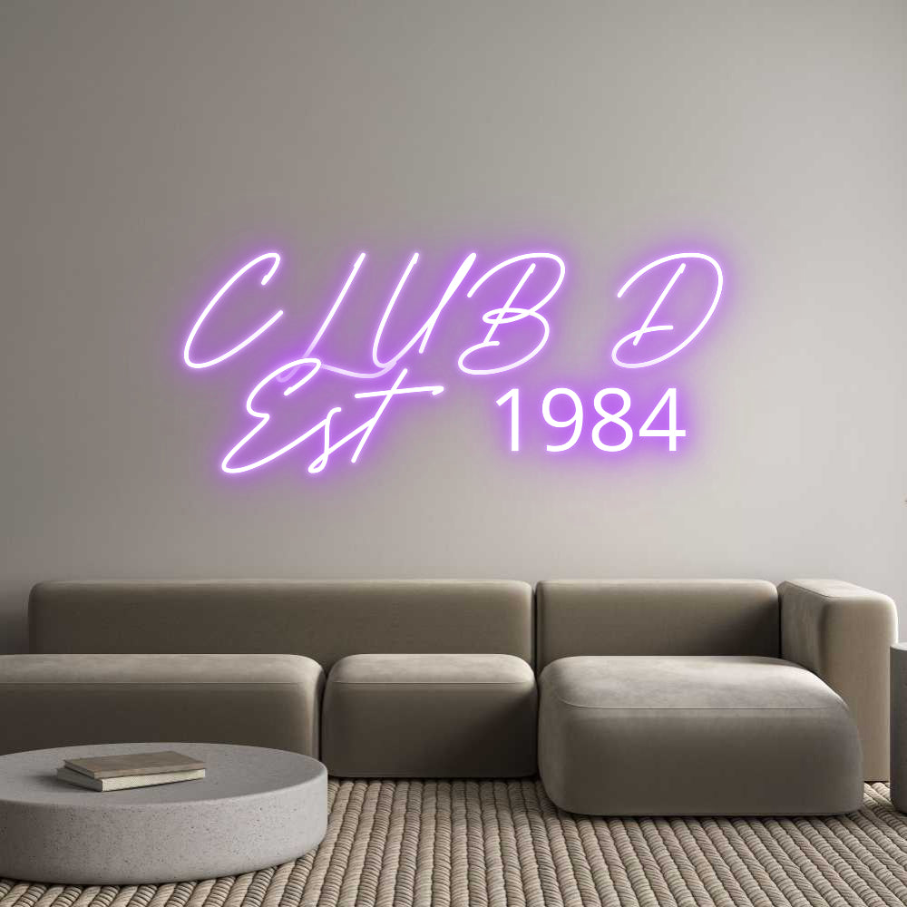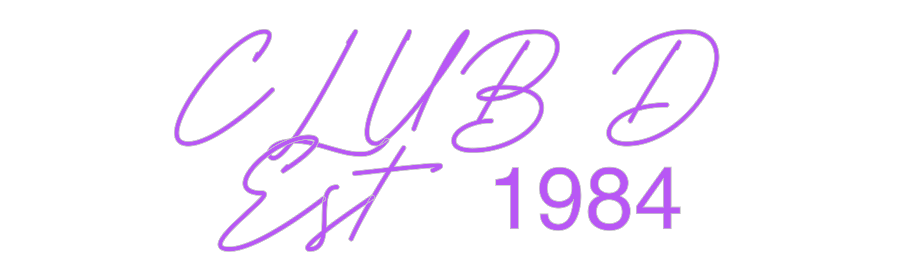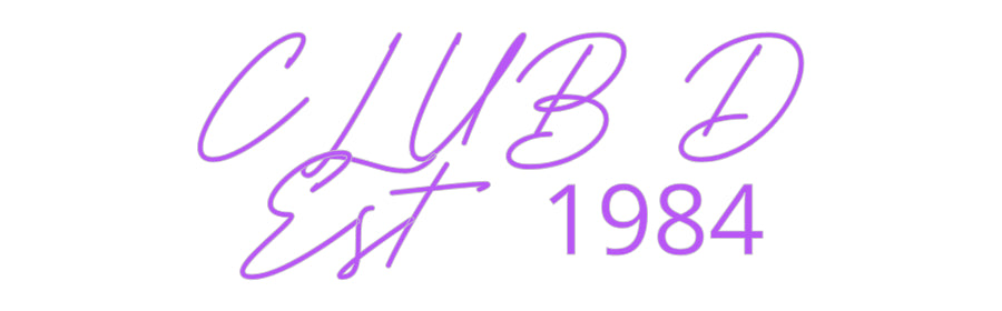 Text: CLUB D Est 1984 Text Align: centerFont: RocketColour: PurpleSize: 60cm wide / 60cm X 31.6cm / 23.62in X 12.44inBackboard: Cut to ShapeBackboard Colour: Clear Acrylic BackboardJacket: Coloured JacketMounting: HangingAdd a Heart or Star (Optional): None (Default)Neon Tube Thickn...