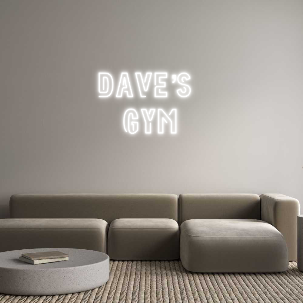 Text: Dave’s Gym Text Align: CenterFont: NeonColor: WhiteSize: 80cm wide / 80cm X 47.14cm / 31.5in X 18.56inBackboard: Cut to Letter (free upgrade)Jacket: White JacketMounting: Wall mounting screwsAdd a Heart or Star (Optional): HeartNeon Tube Thickness: Bold Tube (8mm) (free upg...