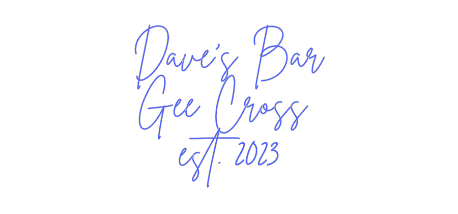 Text: Dave’s Bar Gee Cross est. 2023 Text Align: centerFont: BrittanyColour: BlueSize: 100cm wide / 100cm X 93.52cm / 39.37in X 36.82inBackboard: Cut to ShapeBackboard Colour: Clear Acrylic BackboardJacket: Coloured JacketMounting: Wall mounting screwsAdd a Heart or Star (Optional...