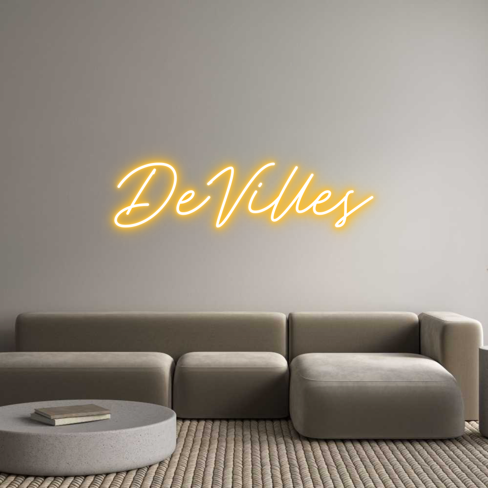 Text: DeVilles Text Align: CenterFont: RocketColor: Light OrangeSize: 60cm wide / 60cm X 15.72cm / 23.62in X 6.19inMaterial: IndoorBackboard: Cut to Letter (free upgrade)Jacket: White JacketMounting: Fast mount kitAdd a Heart or Star (Optional): None (Default)Neon Tube Thickness: Bol...