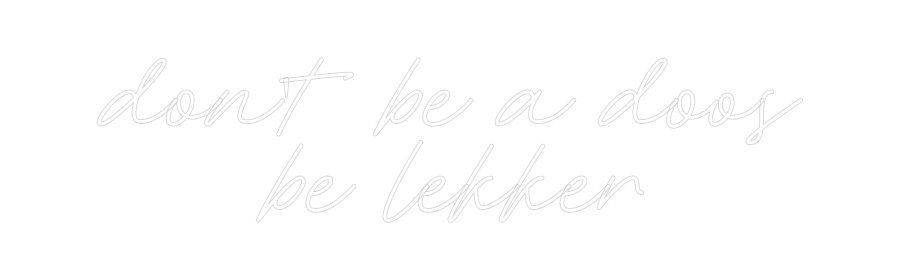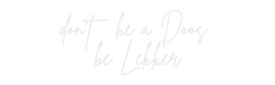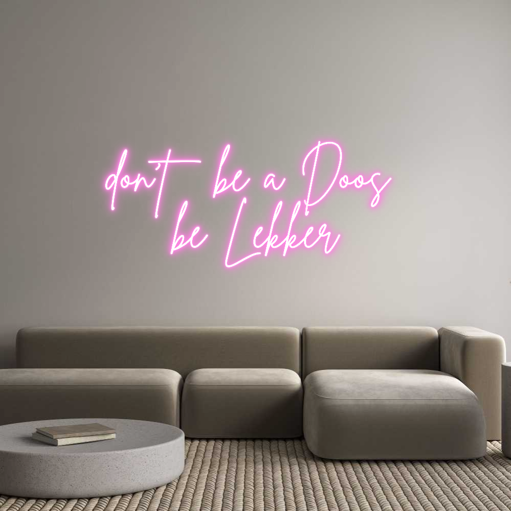 Text: don't be a Doos be Lekker Text Align: centerFont: BrittanyColour: Baby PinkSize: 80cm wide / 80cm X 43.02cm / 31.5in X 16.94inBackboard: Cut to Letter (free upgrade)Jacket: White JacketMounting: Wall mounting screwsAdd a Heart or Star (Optional): None (Default)Neon Tube Thick...
