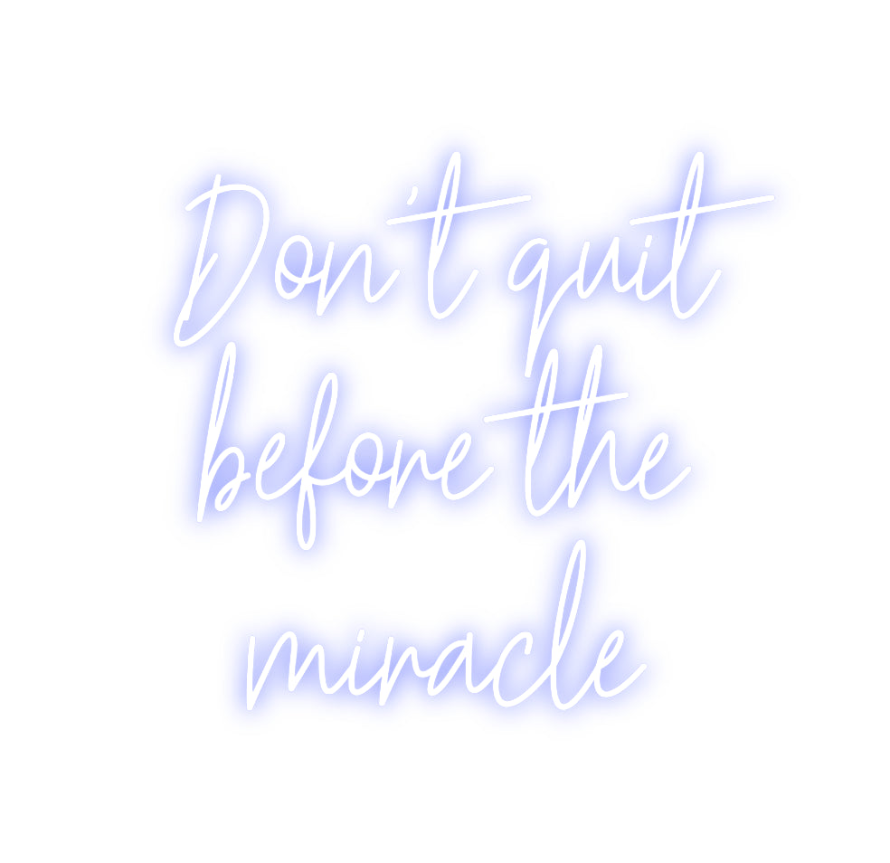 Text: Don't quit before the miracle Text Align: center Font: HestericaColour: BlueSize: 80cm wide / 80cm X 72.75cm / 31.5in X 28.64inBackboard: Cut to Letter (free upgrade)Jacket: Coloured JacketMounting: Wall mounting screwsAdd a Heart or Star (Optional): None (Default)Neon ...
