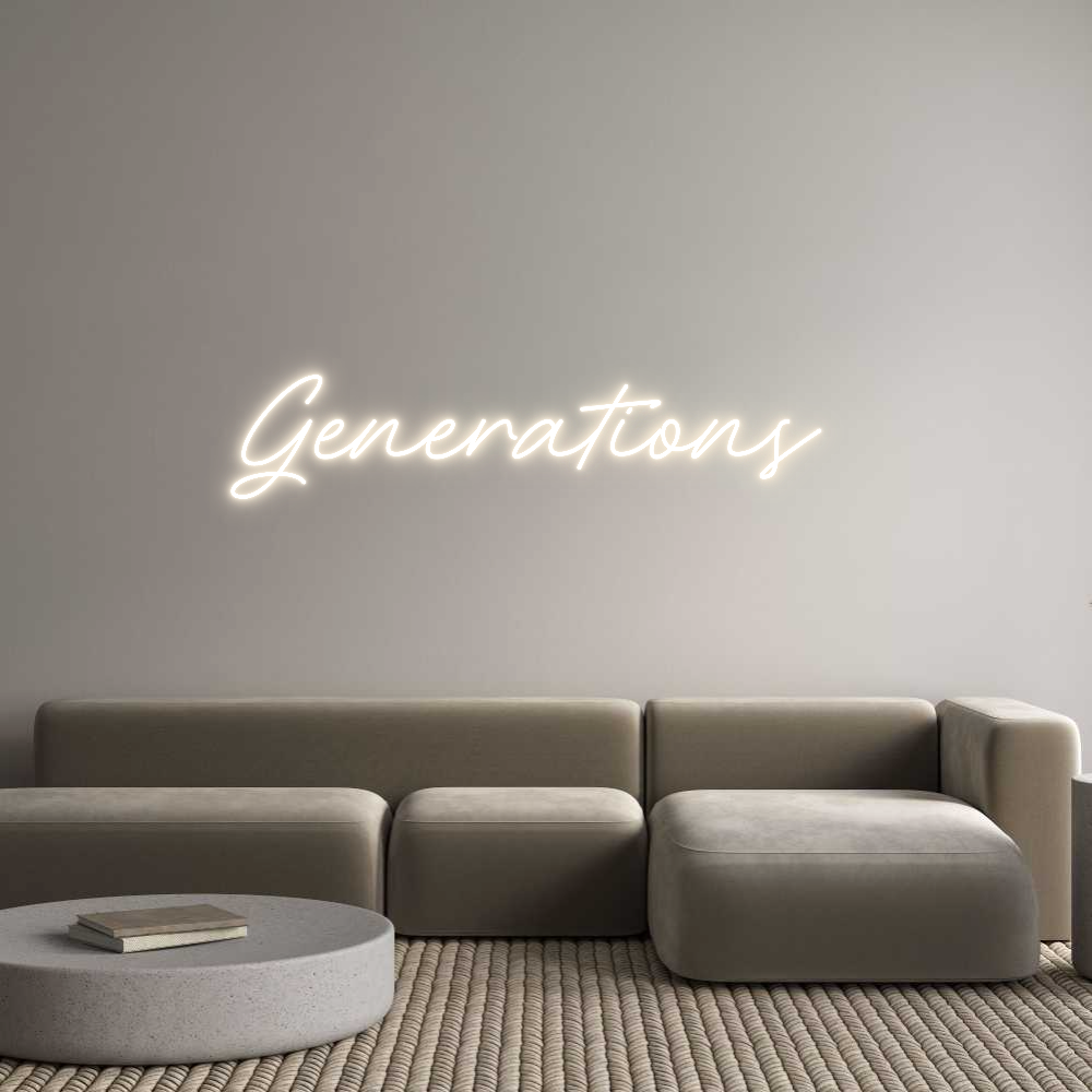 Text: Generations Text Align: leftFont: RocketColour: Warm WhiteSize: 120cm wide / 120cm X 24.62cm / 47.24in X 9.69inBackboard: Cut to ShapeBackboard Colour: Clear Acrylic BackboardJacket: White JacketMounting: Wall mounting screwsAdd a Heart or Star (Optional): None (Default)Neon T...