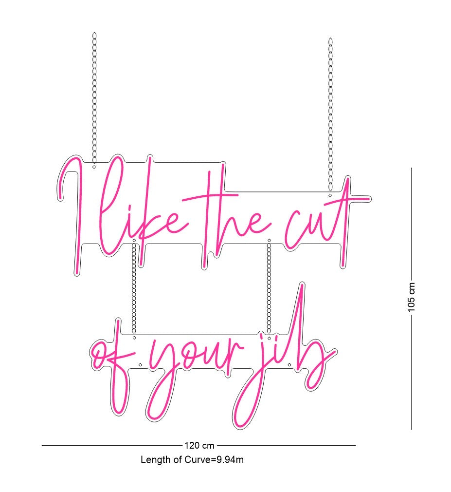 Original LogoText: I like the cut of your jib Text Align: CenterFont: SilvertoneColor: PinkSize: 120cm wide / 120cm X 60.01cm / 47.24in X 23.63inMaterial: Outdoor (+30%) Backboard: Cut to ShapeBackboard Color: Clear Acrylic BackboardJacket: Coloured JacketMounting: HangingAdd a Heart or S...
