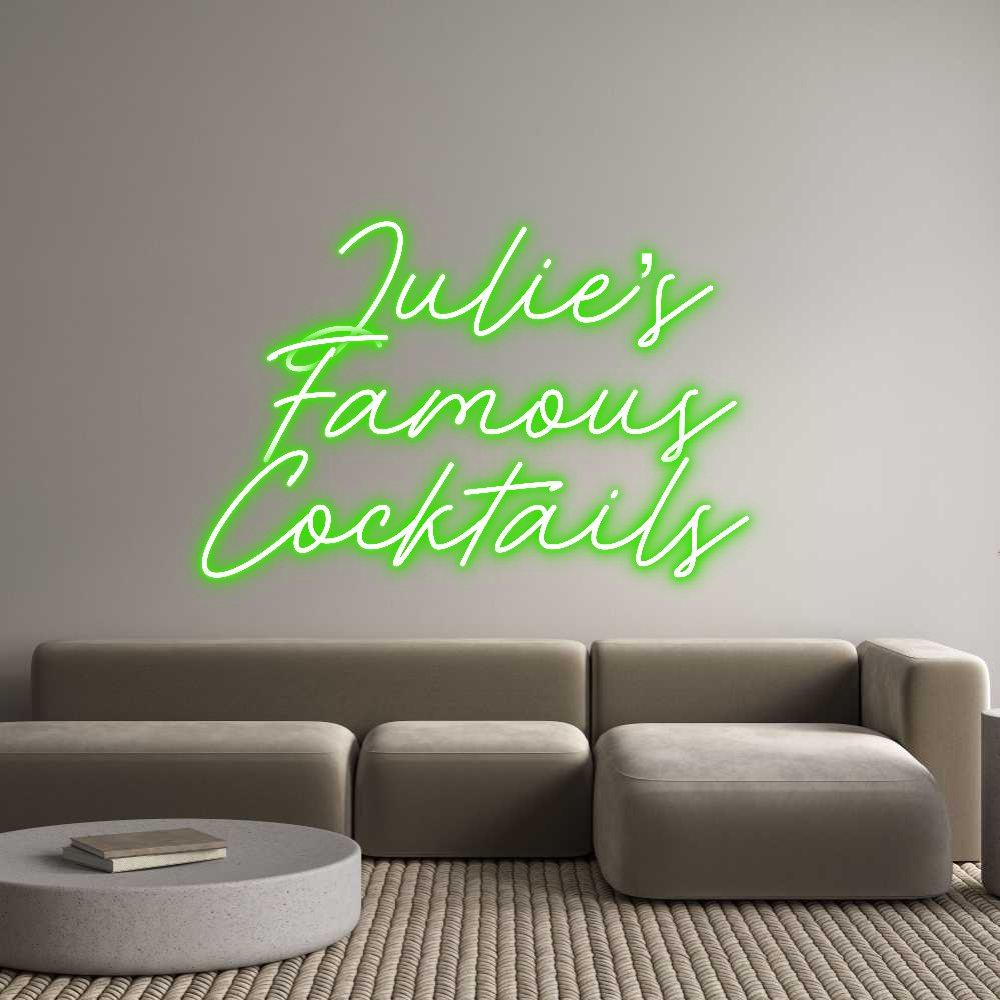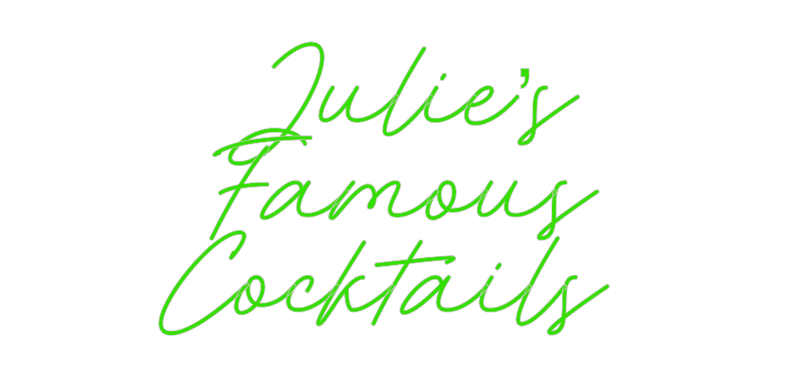 Text: Julie’s Famous Cocktails Text Align: centerFont: RocketColour: GreenSize: 60cm wide / 60cm X 50.81cm / 23.62in X 20.01inBackboard: Cut to Letter (free upgrade)Jacket: Coloured JacketMounting: Wall mounting screwsAdd a Heart or Star (Optional): None (Default)Neon Tube Thickne...
