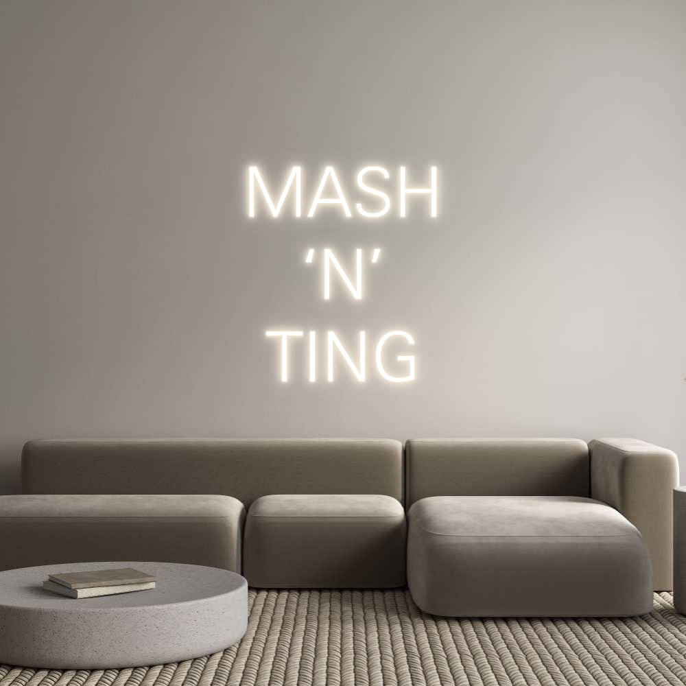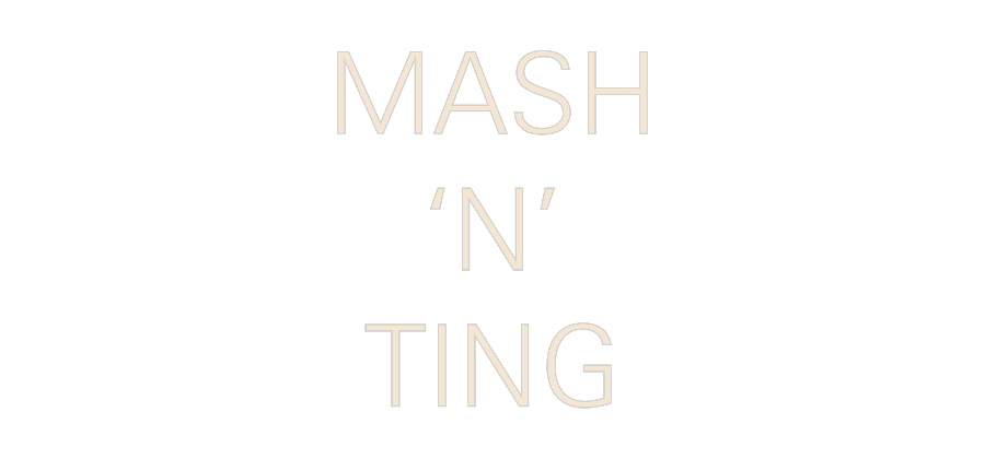 Text: MASH ‘N’ TING Text Align: centerFont: ZurichColour: Warm WhiteSize: 40cm wide / 40cm X 45.3cm / 15.75in X 17.83inBackboard: Cut to Letter (free upgrade)Jacket: Coloured JacketMounting: Wall mounting screwsAdd a Heart or Star (Optional): None (Default)Neon Tube Thickness: Bold...