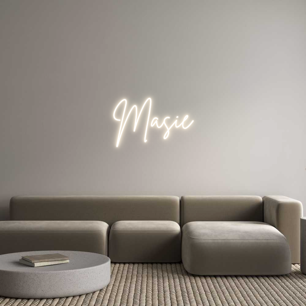 Text: Masie Text Align: LeftFont: BrittanyColor: Warm WhiteSize: 80cm wide / 80cm X 46.11cm / 31.5in X 18.16inBackboard: Cut to ShapeBackboard Color: Clear Acrylic BackboardJacket: White JacketMounting: Wall mounting screwsAdd a Heart or Star (Optional): None (Default)Neon Tube Thick...