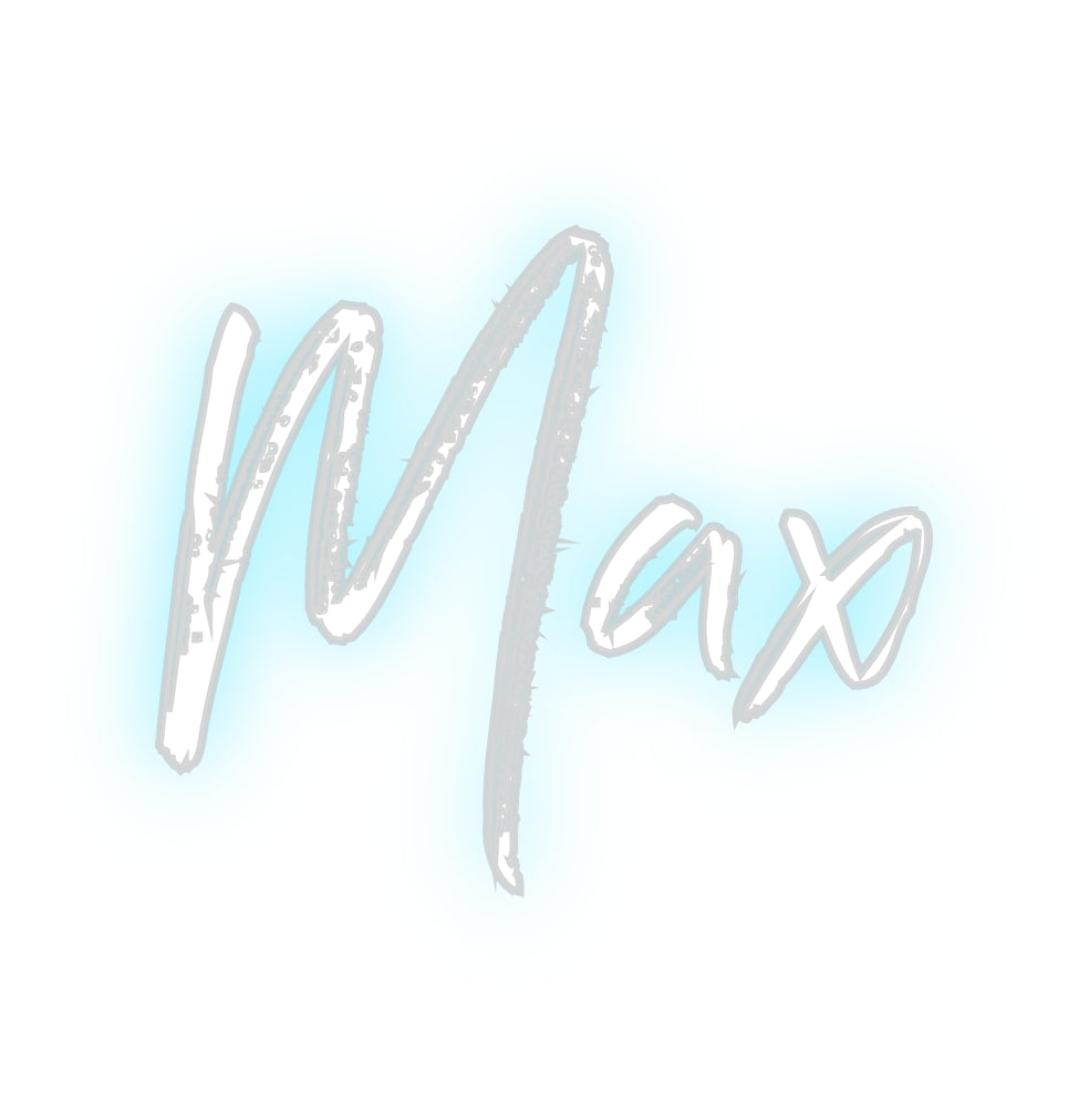 Text: Max Text Align: left Font: NorthwellColour: Ice BlueSize: 20cm wide / 20cm X 19.35cm / 7.87in X 7.62inBackboard: Cut to ShapeBackboard Colour: Clear Acrylic BackboardJacket: Coloured JacketMounting: Wall mounting screwsAdd a Heart or Star (Optional): None (Default)Neon Tube Thi...