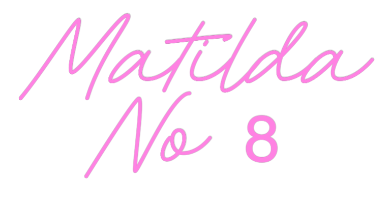 Original LogoText: Matilda No 8 Text Align: LeftFont: RocketColor: Baby PinkSize: 100cm wide / 100cm X 59.19cm / 39.37in X 23.3inMaterial: IndoorBackboard: Cut to Letter (free upgrade)Jacket: Coloured JacketMounting: Wall mounting screwsAdd a Heart or Star (Optional): HeartNeon Tube Thic...