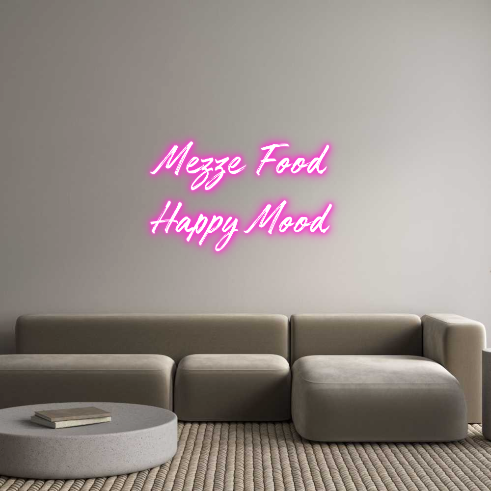 Text: Mezze Food Happy Mood Text Align: LeftFont: WorldColor: PinkSize: 60cm wide / 60cm X 38.66cm / 23.62in X 15.22inMaterial: IndoorBackboard: Cut to ShapeBackboard Color: Gold MirrorJacket: White JacketMounting: Wall mounting screwsAdd a Heart or Star (Optional): None (Default)Neon Tu...