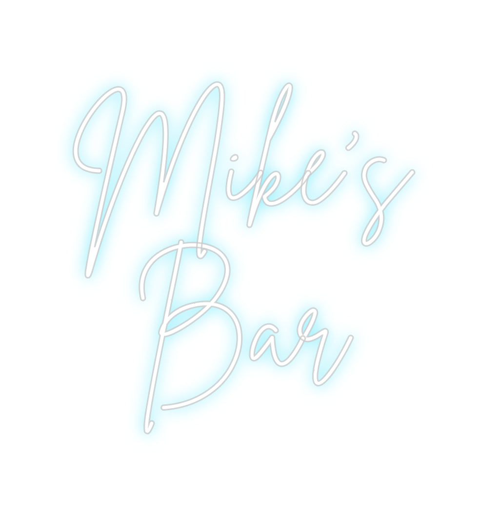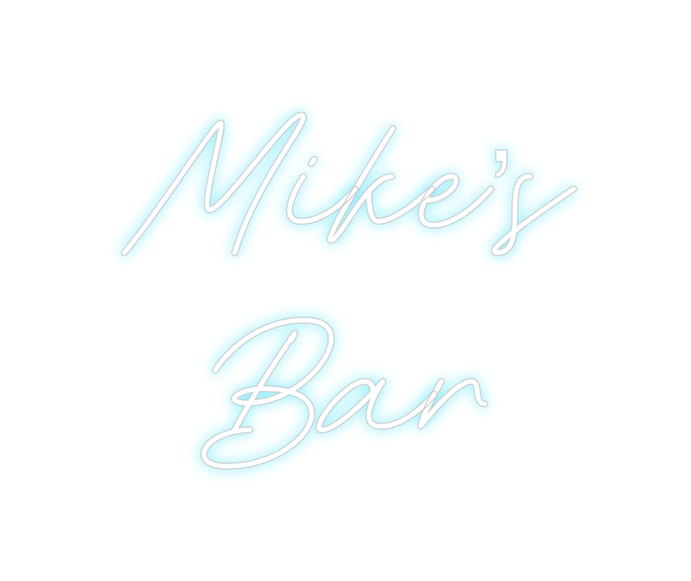 Text: Mike’s Bar Text Align: center Font: RocketColour: Ice BlueSize: 60cm wide / 60cm X 46.82cm / 23.62in X 18.43inBackboard: Cut to Letter (free upgrade)Jacket: Coloured JacketMounting: Wall mounting screwsAdd a Heart or Star (Optional): None (Default)Neon Tube Thickness: Bo...