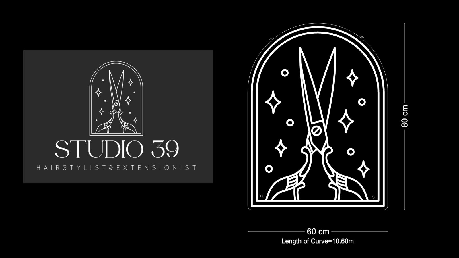 Text: Studio39 Text Align: centerFont: WorldColour: WhiteSize: 60cm wide / 60cm X 14.12cm / 23.62in X 5.56inBackboard: Cut to Letter (free upgrade)Jacket: White JacketMounting: Wall mounting screwsAdd a Heart or Star (Optional): None (Default)Neon Tube Thickness: Bold Tube (8mm) (fre...