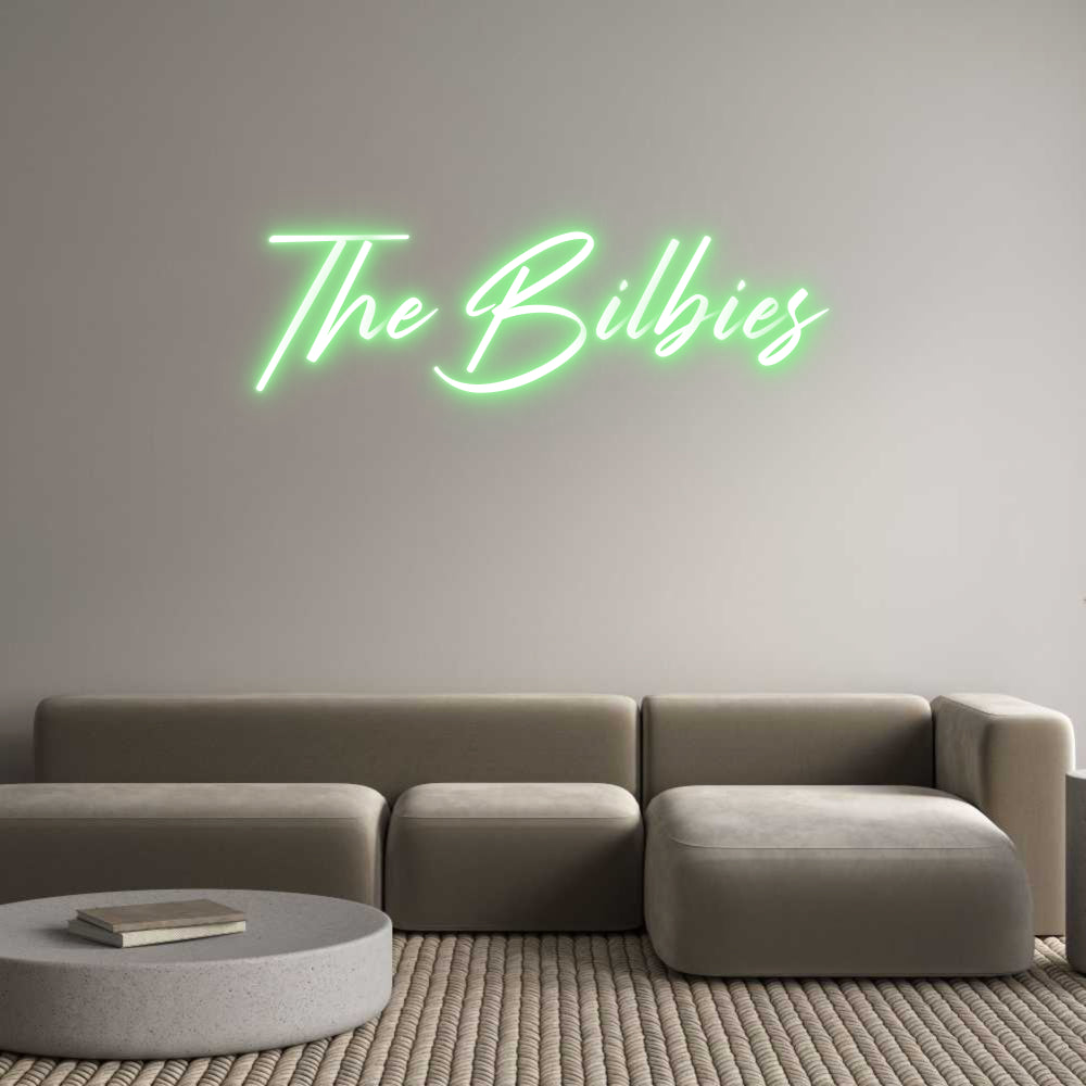 Text: The Bilbies Text Align: left Font: StrudeColour: Ice BlueSize: 80cm wide / 80cm X 22.54cm / 31.5in X 8.87inBackboard: Cut to Letter (free upgrade)Jacket: Coloured JacketMounting: Wall mounting screwsAdd a Heart or Star (Optional): None (Default)Neon Tube Thickness: Bold T...