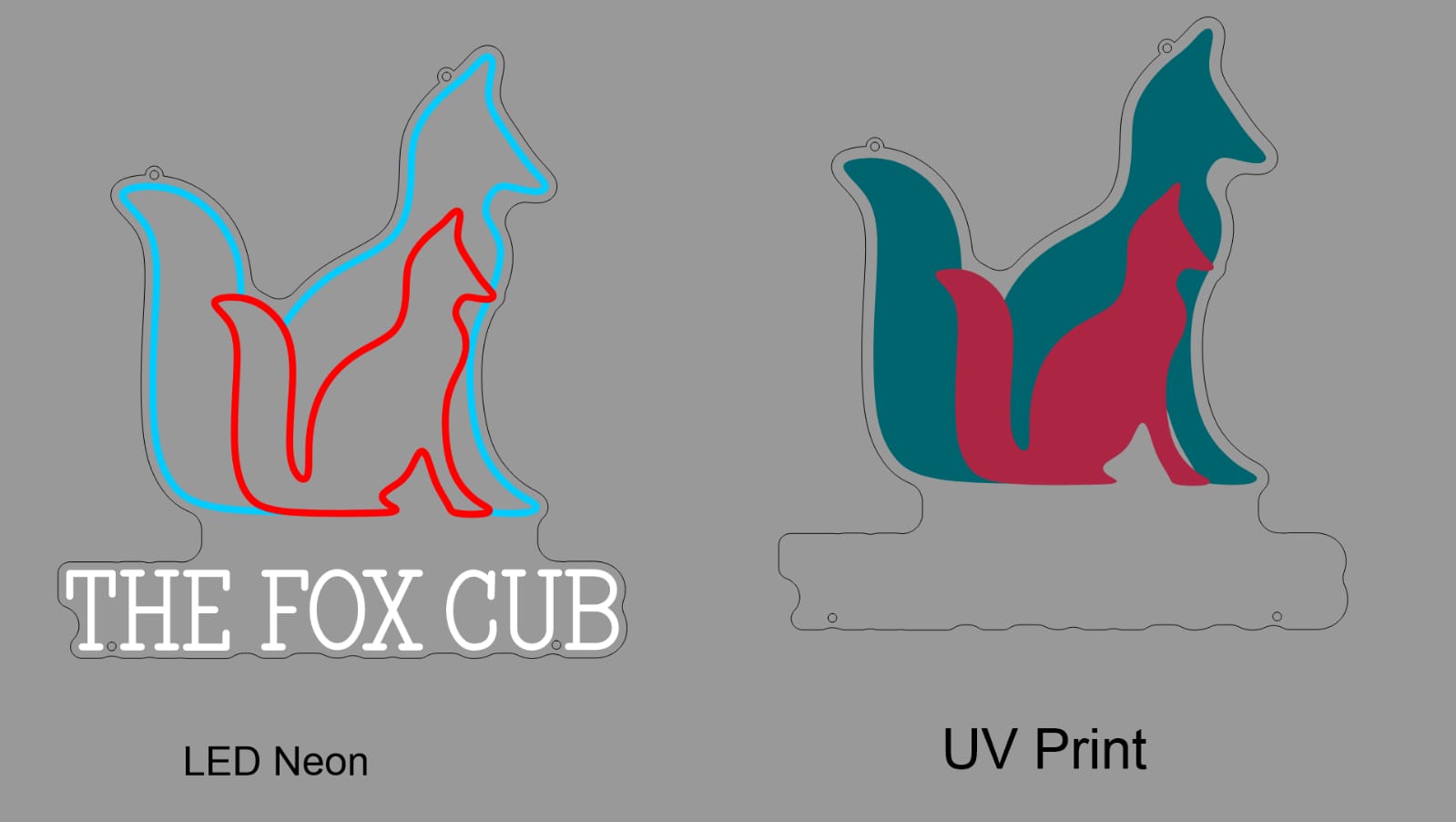 Text: The Fox’s Den Text Align: left Font: OttawaColour: RedSize: 100cm wide / 100cm X 30.46cm / 39.37in X 11.99inBackboard: Cut to ShapeBackboard Colour: Clear Acrylic BackboardJacket: Coloured JacketMounting: HangingAdd a Heart or Star (Optional): None (Default)Neon Tube Thic...