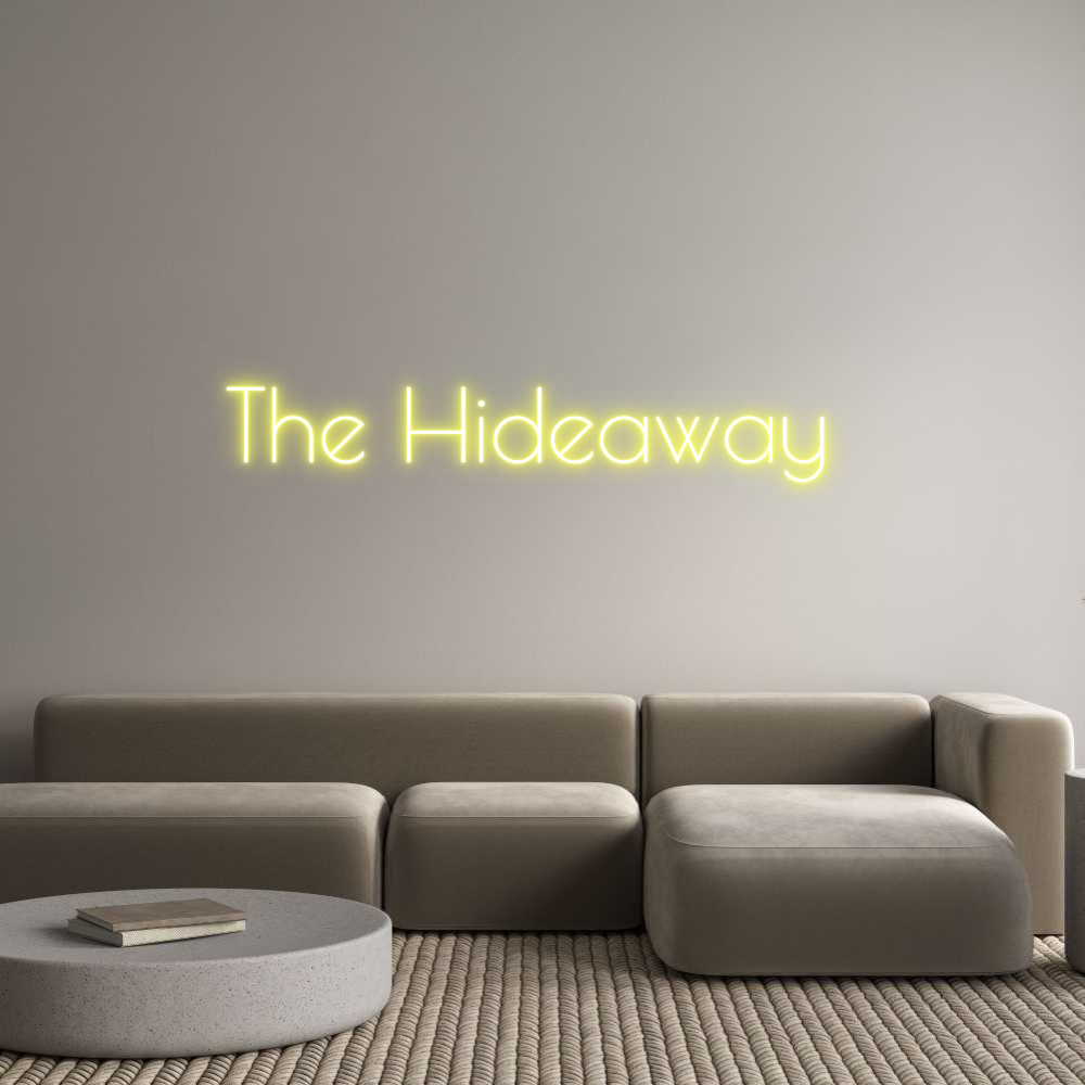 Text: The Hideaway Text Align: CenterFont: PoiretColor: YellowSize: 80cm wide / 80cm X 12.52cm / 31.5in X 4.93inBackboard: Cut to ShapeBackboard Color: Clear Acrylic BackboardJacket: Coloured JacketMounting: HangingAdd a Heart or Star (Optional): None (Default)Neon Tube Thickness: C...