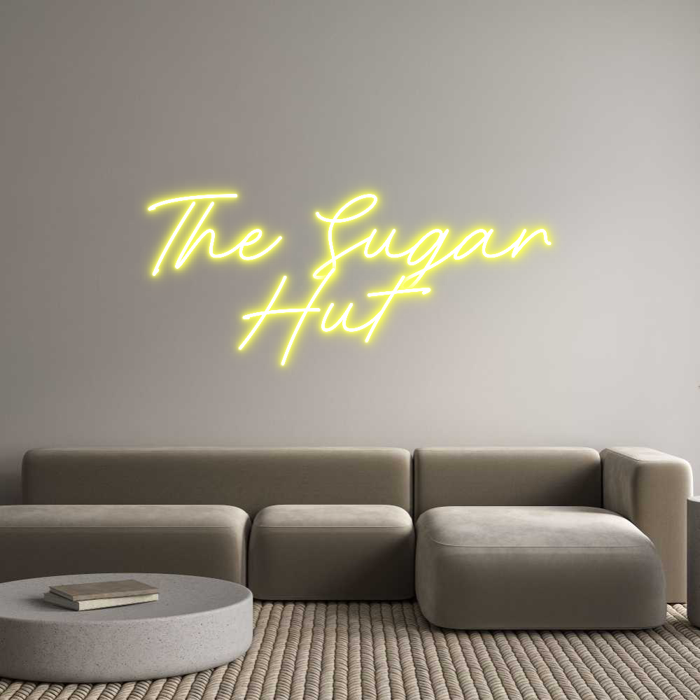 Text: The Sugar Hut Text Align: CenterFont: RocketColor: YellowSize: 60cm wide / 60cm X 32.52cm / 23.62in X 12.8inBackboard: Cut to Letter (free upgrade)Jacket: White JacketMounting: Fast mount kitAdd a Heart or Star (Optional): HeartNeon Tube Thickness: Bold Tube (8mm) (free upgra...