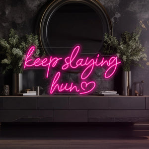 Level up your ambiance and make a bold statement with the 'Keep Slaying Hun' Neon Sign – a beacon of empowerment and style. Order now and let the neon lights become a daily reminder to embrace your power and keep slaying, hun!